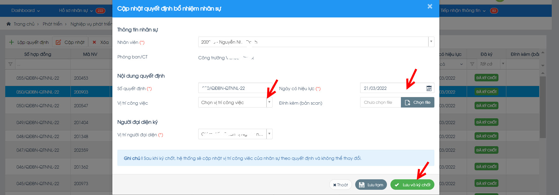 Sau đó, tiền hành cập nhật các trường thông tin như: NGÀY CÓ HIỆU LỰC, VỊ TRÍ CÔNG VIỆC, ... và click vào lệnh "Lưu và ký chốt"