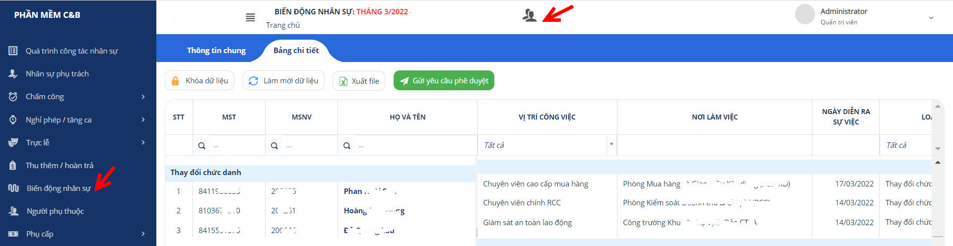 Vào phần mềm Lương-> menu Biến động nhân sự -> Chọn kỳ lương -> Chọn vào icon 2 hình người như hình bên dưới: