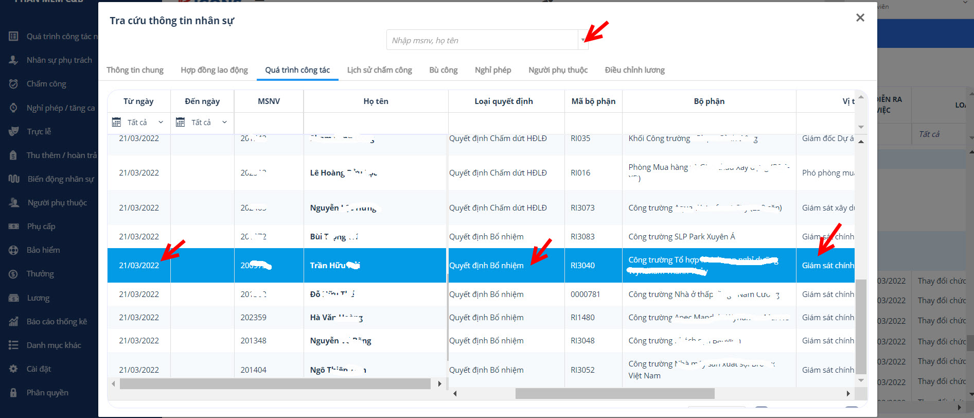 Sau đó tìm nhân sự và xem thông tin VỊ TRÍ CÔNG TÁC, TỪ NGÀY, LOẠI QUYẾT ĐỊNH BỔ NHIỆM