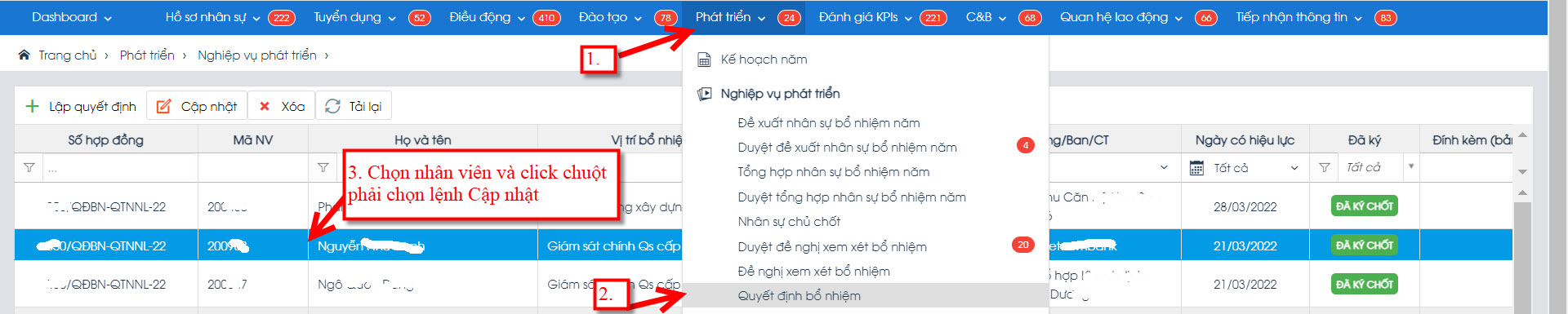 Vào phần mềm Hris-> menu Phát triển -> menu Quyết định bổ nhiệm -> Tìm tên nhân viên -> chọn nhân viên và nhấn chuột phải để chọn lệnh Cập nhật, theo thứ tự các bước như hình bên dưới: