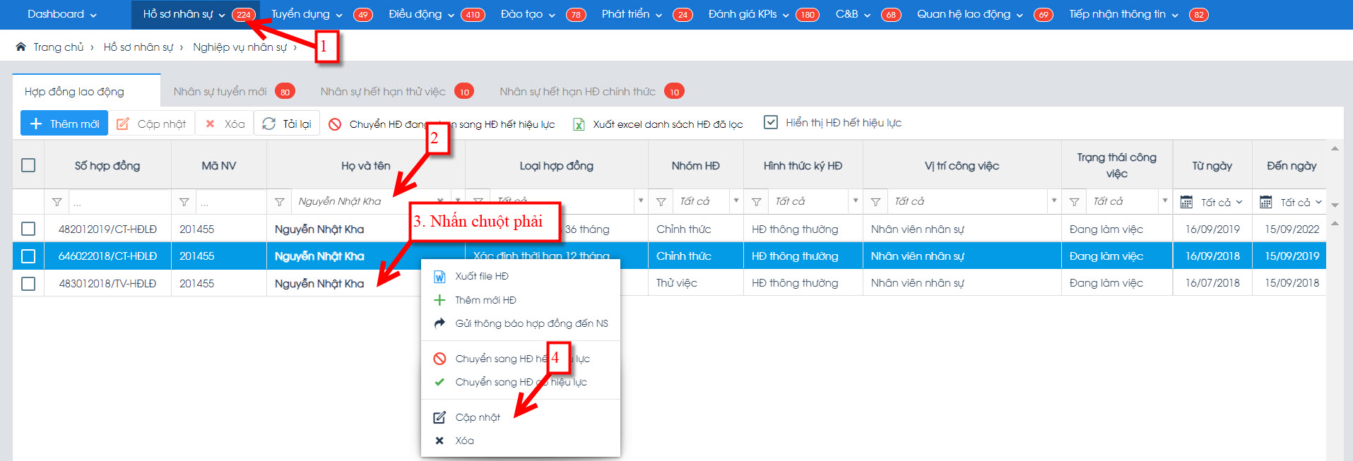 Vào phần mềm Hris -> menu Hồ sơ nhân sự -> menu Hợp đồng lao động -> Chọn nhân viên và nhấn chuột phải chọn lệnh "Cập nhật"