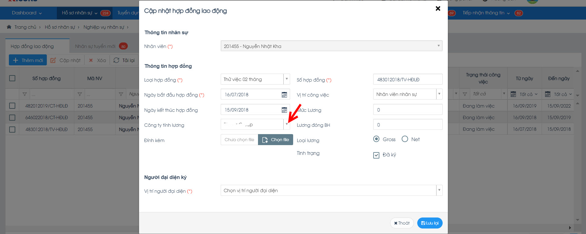 Sau đó tìm nhân sự và xem hợp đồng chính thức tại cột "Công ty tính lương" đã có xác định công ty nào tính lương hay chưa và có đúng không.