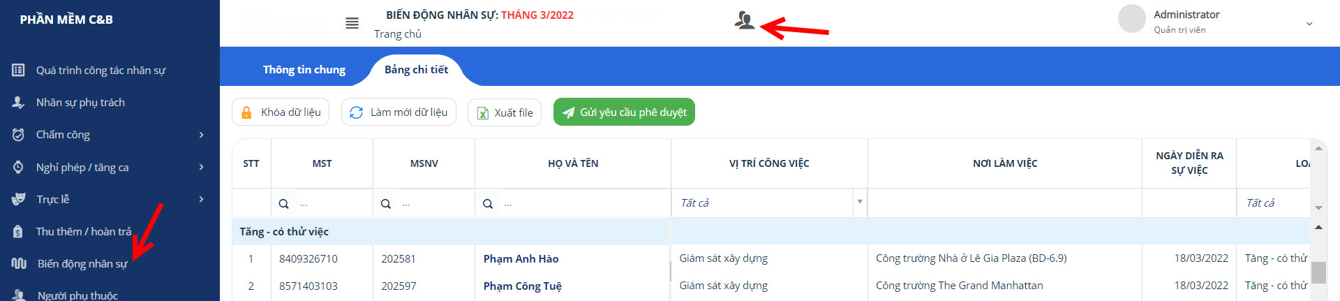 Biến động nhân sự TĂNG có thử việc dựa vào các dữ liệu bên dưới, nếu không đầy đủ và chính xác thông tin của 3 dữ liệu bên dưới thi phần biến động này sẽ bị dư/thiếu nhân sự: